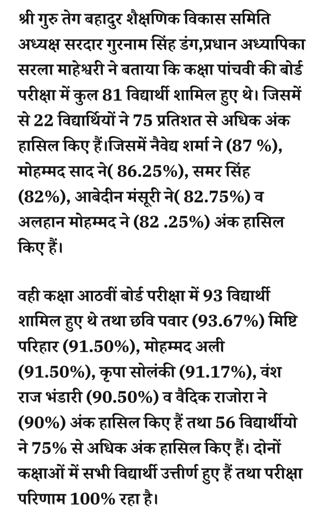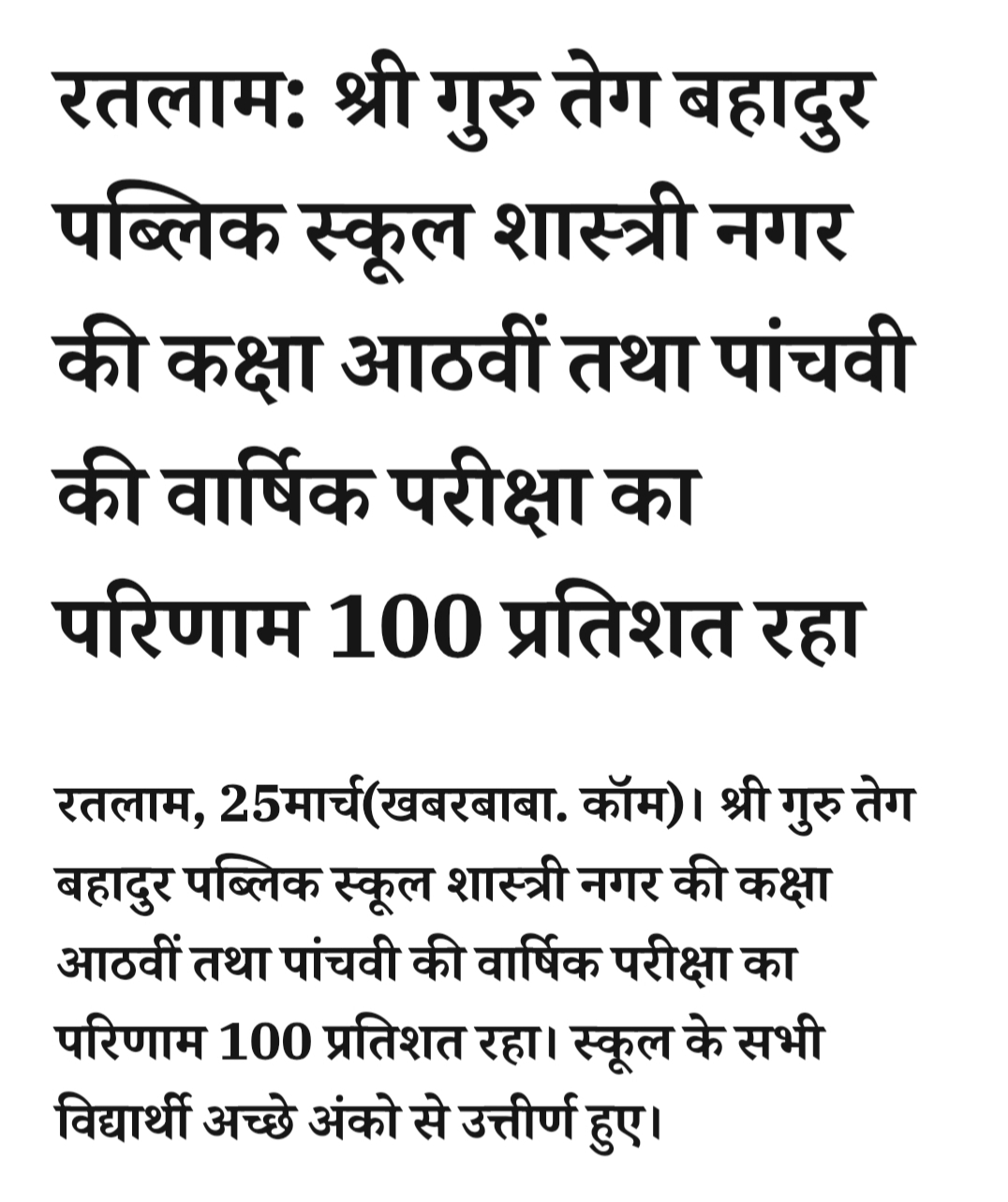 रतलाम: श्री गुरु तेग बहादुर पब्लिक स्कूल शास्त्री नगर की कक्षा आठवीं तथा पांचवी की वार्षिक परीक्षा का परिणाम 100 प्रतिशत रहाMarch 25, 2026