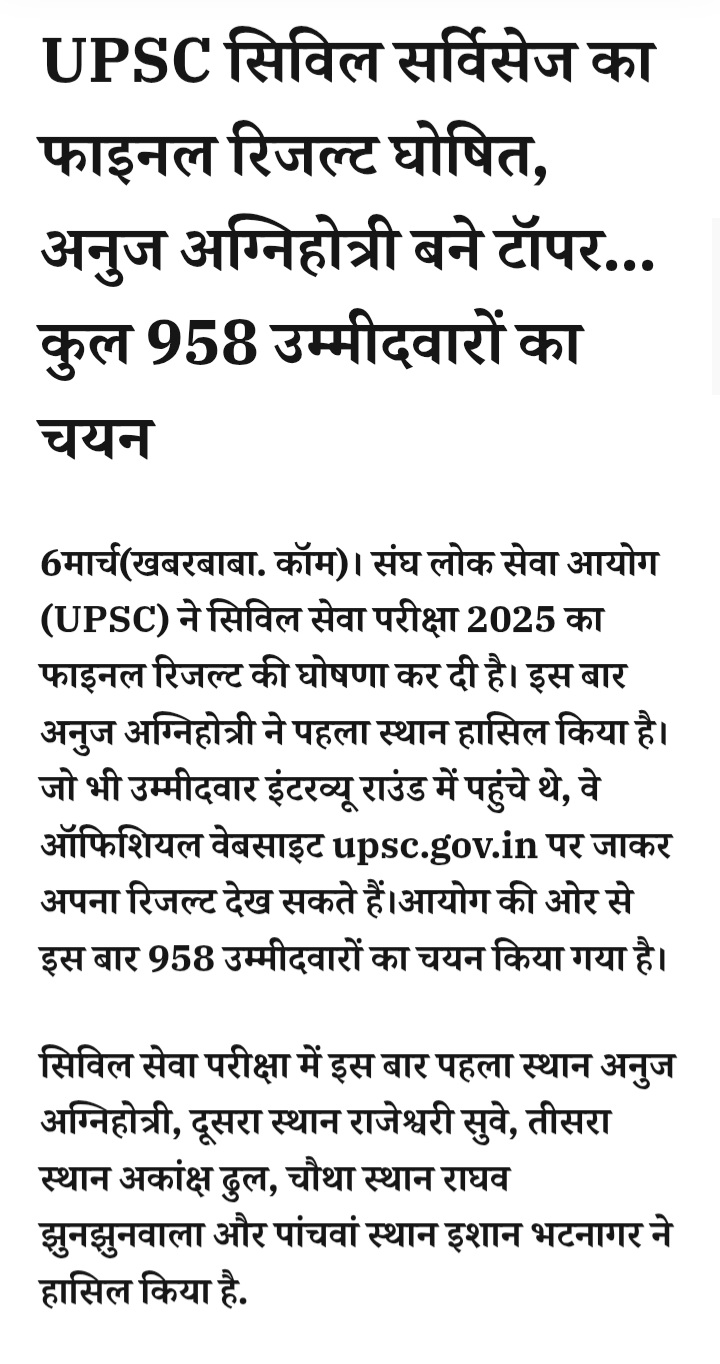 UPSC सिविल सर्विसेज का फाइनल रिजल्ट घोषित, अनुज अग्निहोत्री बने टॉपर…कुल 958 उम्मीदवारों का चयन