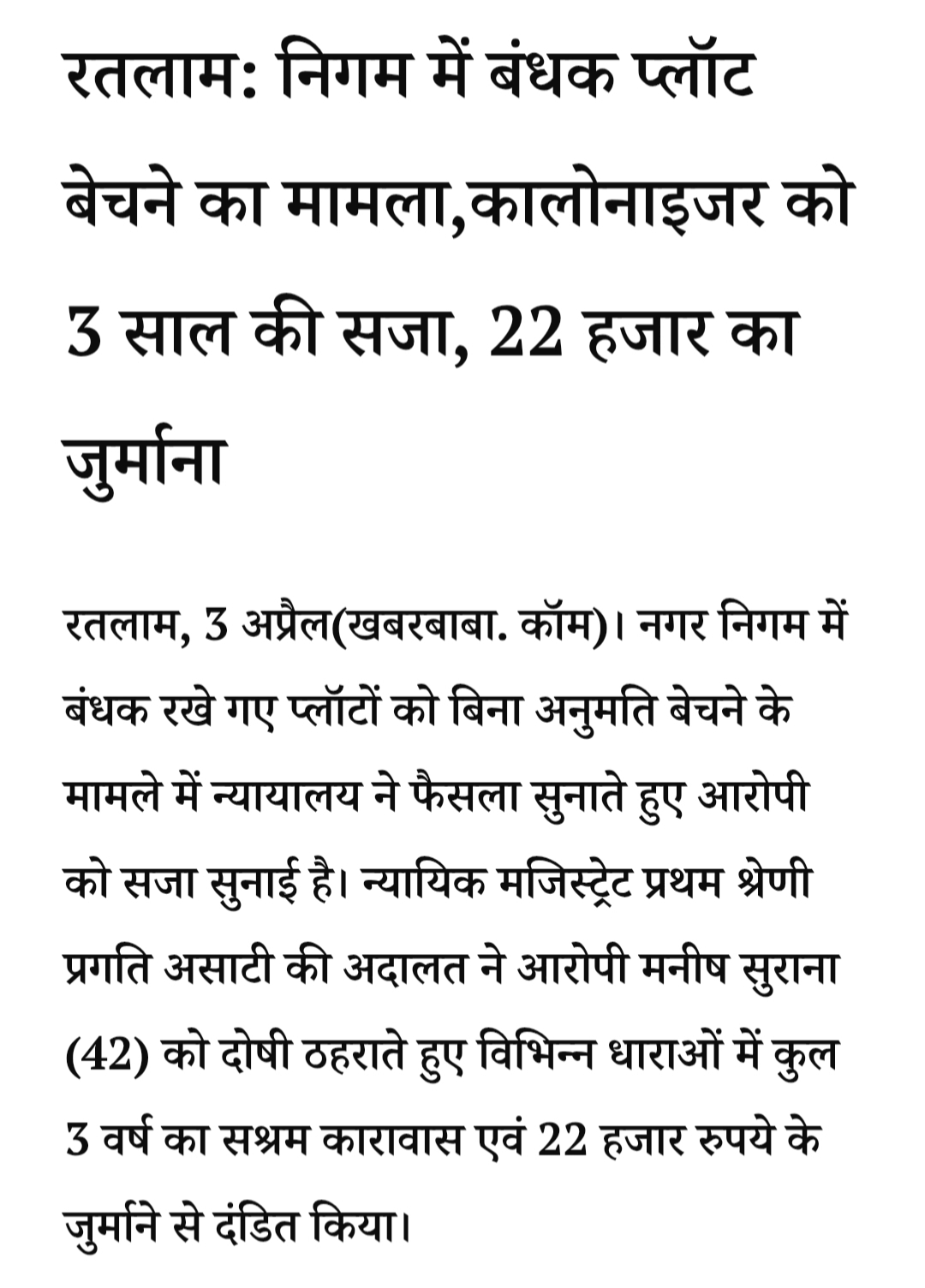 रतलाम: निगम में बंधक प्लॉट बेचने का मामला,कालोनाइजर को 3 साल की सजा, 22 हजार का जुर्मानाApril 3, 2026
